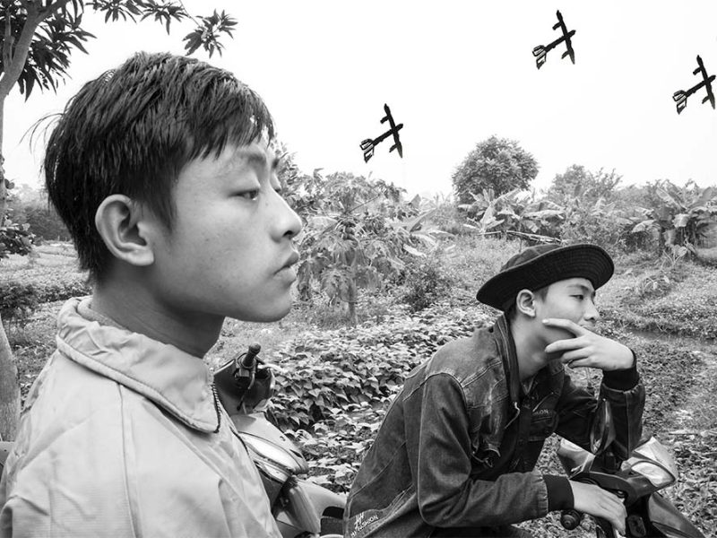 Andrea Orejarena and Caleb Stein’s multimedia work Long Time No See (which consists of photographs, videos and drawings) deals with the two critical issues that we have faced in the field of photography up to the present day: who has a license to tell stories/make images of others who are deeply affected by a violent and traumatic history; and how photography, a frozen image, can convey the nuances and complexities of the narratives of others. The artists created the work through the collaborative process of more than 2 years: visual exchange with four-generations of Vietnamese people, including Vietnamese veterans, whose lives have changed forever by Agent Orange in the Vietnam-American War. The duo’s practice suggests meaningful directions to the issues through their full collaboration with the Vietnamese participants who were resident at Làng Hữu Nghi (Vietnam Friendship Village) and participated in video interviews, drew, and photographed, contributing to the work. The work is situated between reality and fiction, as seen, for example, in the photograph of two young men that the duo made and on which a participant drew images of bombers (thus breaking the stillness of the photo). The work reflects the memories and dreams of the Vietnamese participants, and presents quiet yet powerful, time-traveling, future dreaming individual and collective narratives of the war, revealed through the artists’ interventions.